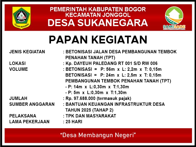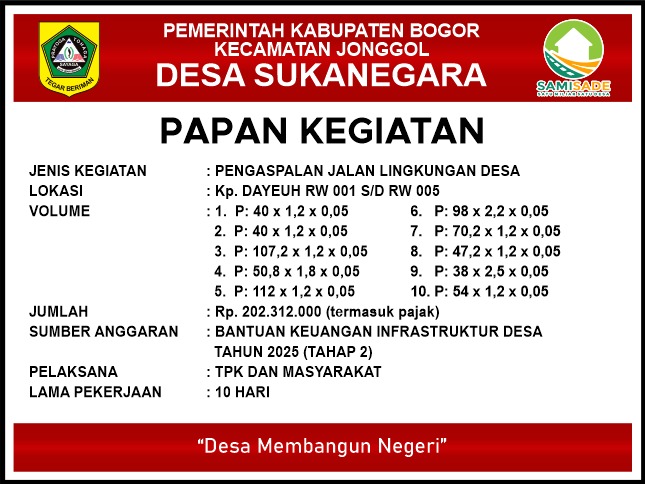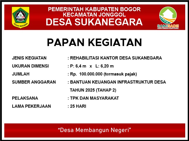 Pemerintah Desa Sukanegara, Kecamatan Jonggol, Kabupaten Bogor, terus menunjukkan komitmennya dalam meningkatkan pelayanan publik dan kualitas infrastruktur desa melalui pemanfaatan Bantuan Keuangan Infrastruktur Desa Tahun Anggaran 2025 Tahap II.